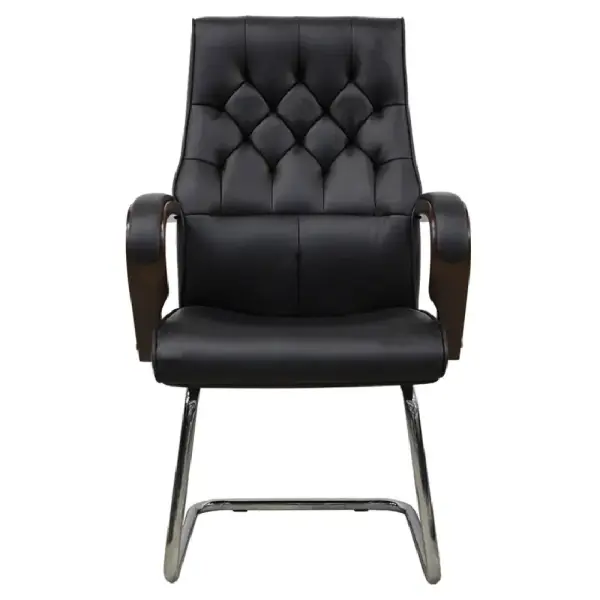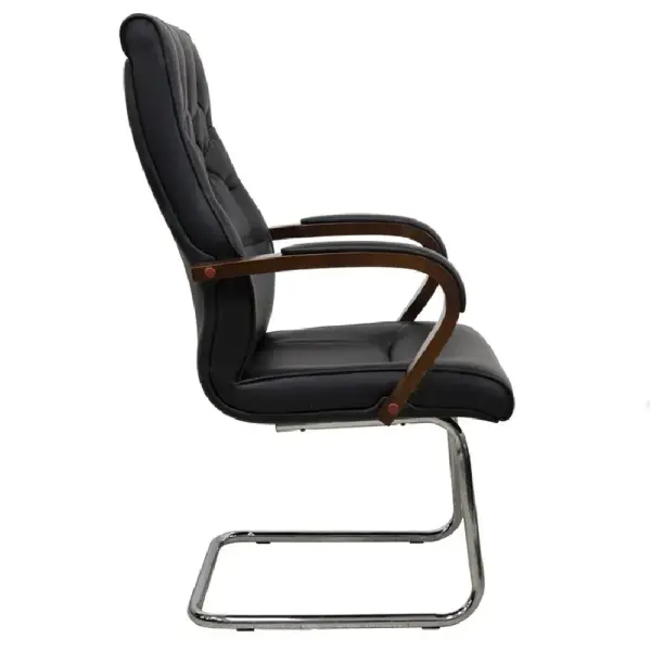 Офисное кресло CHAIRMAN 2338B, Black — это элегантное кресло для посетителей с широким сиденьем и мягкой обивкой, обеспечивающей высокий комфорт. Каркас выполнен из хромированного металла, что придает прочность и устойчивость конструкции. Обивка изготовлена из искусственной кожи черного цвета, которая отличается практичностью и легкостью в уходе. Деревянные накладки на подлокотниках придают модели солидный и стильный вид. Максимальная нагрузка на кресло составляет 100 кг, что делает его подходящим для офисных залов ожидания и переговорных комнат.